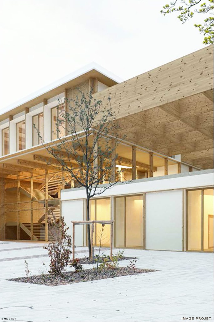 Catégorie: Construction écologique du groupe scolaire Maîtrise d’œuvre: Mil-lieux & Studio écho Architecture, EDE-Ingenierie Surface du projet: 3 383 m² Budget de travaux : 11 500 000 € HT Maitrise d’ouvrage: Mantes-le-Ville Etape du projet: Concours Démarche écologique: Toiture-terrasse végétalisée, isolant rigide en toiture froide en liège expansé, panneaux CLT,