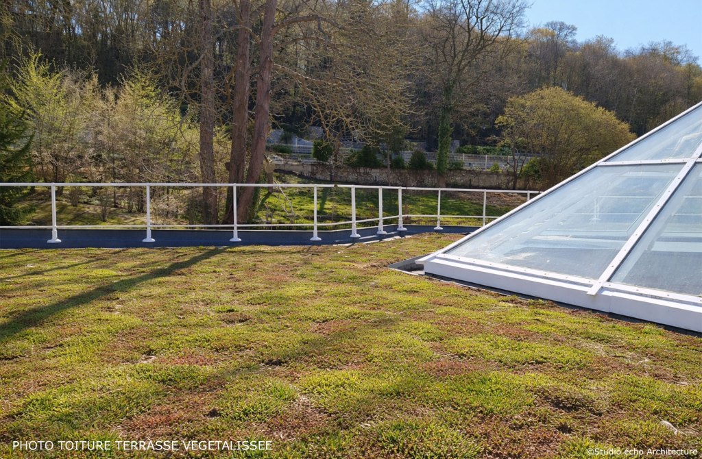 L’étanchéité des toitures-terrasses couvrant les deux préaux des écoles sera refaite dans le cadre de la réhabilitation du groupe scolaire. Les toitures seront végétalisées afin de limiter les îlots de la chaleur en période estivale. Par ailleurs, la végétalisation s’intègre parfaitement dans le paysage rural de la commune et permet d’améliorer la qualité architecturale de la cinquième façade, auparavant couverte par une membrane d’étanchéité noire.