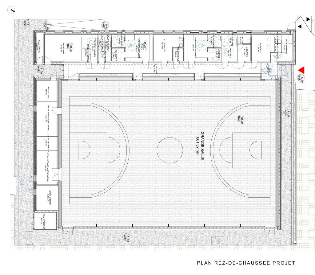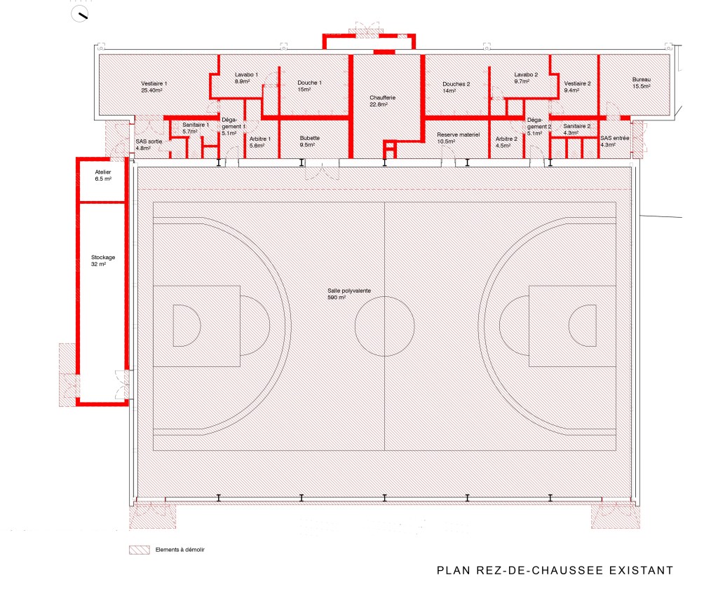 À l’intérieur du bâtiment, les espaces seront complètement reconfigurés et bénéficieront d’une réhabilitation éco-responsable. Les revêtements des sols, murs et plafonds seront réalisés à partir de matériaux recyclés et recyclables, contribuant à la gestion durable des ressources. Une partie des matériaux et équipements existants sera également réemployée, soutenant ainsi une approche circulaire dans la construction. En effet, l’architecture écologique est également synonyme de confort et de bien-être pour ses occupants. En combinant design innovant et respect de l’environnement, ce projet cherche a offrir des espaces de vie adaptés aux besoins modernes, tout en réduisant la consommation de ressources naturelles et en favorisant la durabilité à long terme du gymnase.