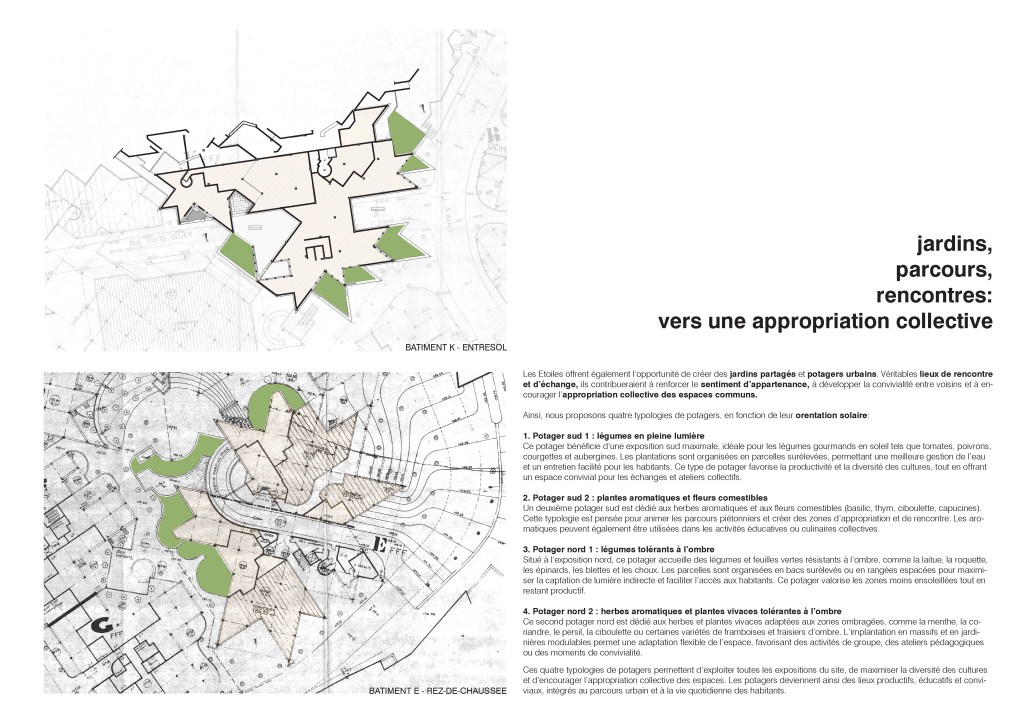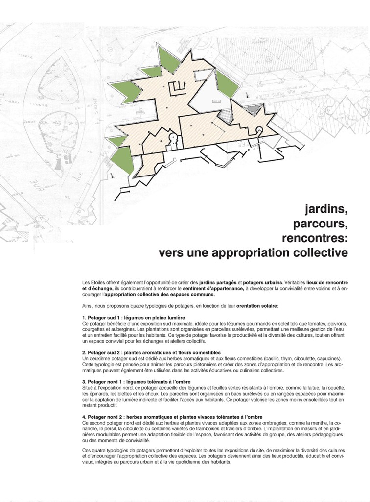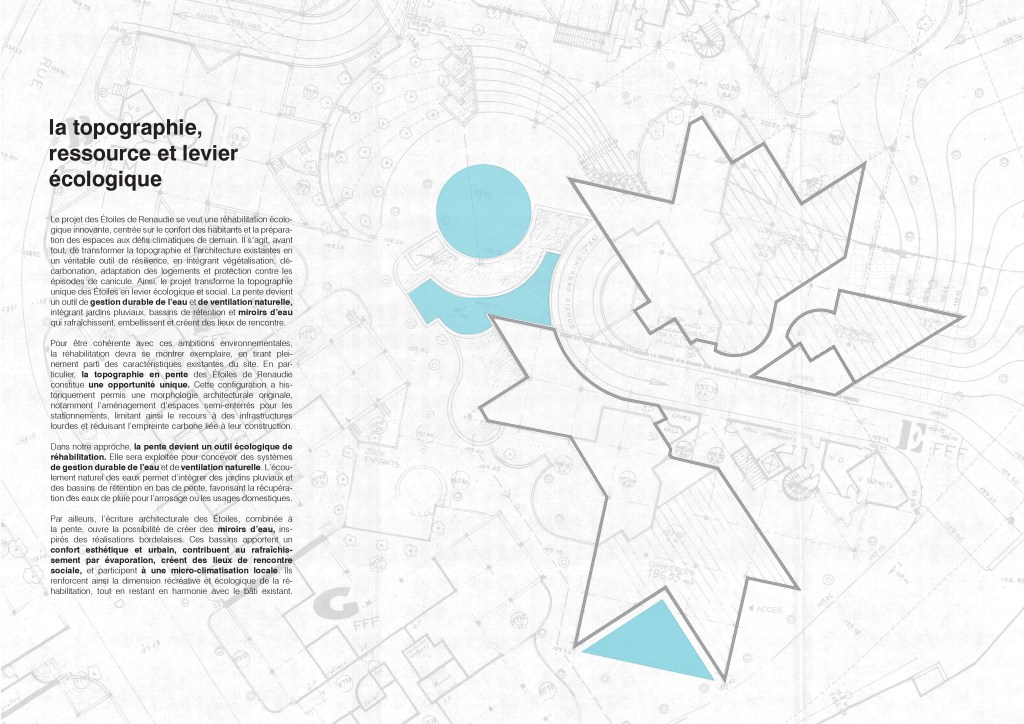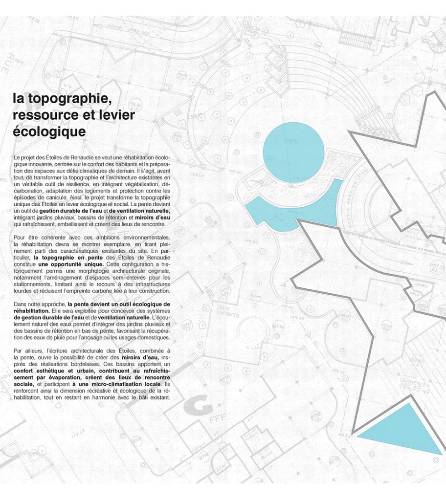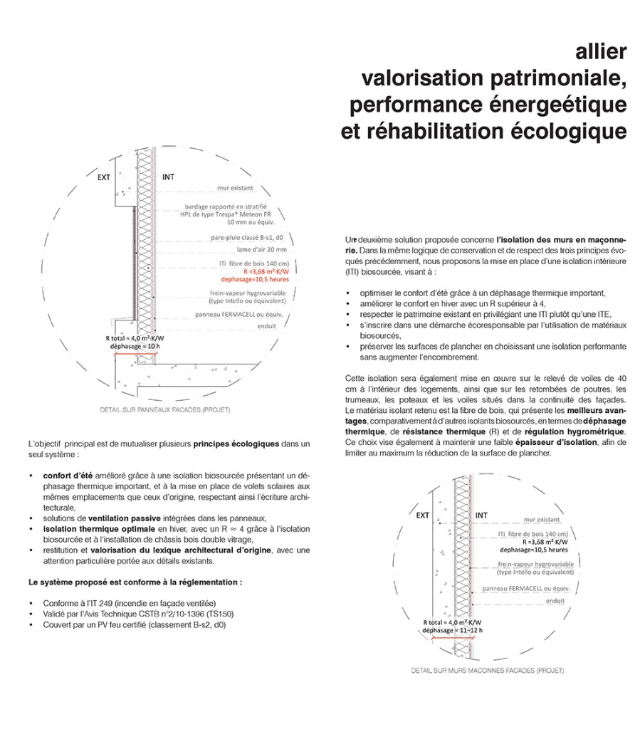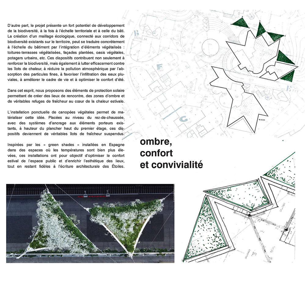 Catégorie: Réhabilitation écologique patrimoniale des Etoiles à Givors (Jean RENAUDIE) Architecte: Studio écho Architecture en collaboration avec Clémentine VANDEPUTTE – avocate fiscaliste (volet optimisations fiscales & financements) Maitrise d’ouvrage: Le groupe 3F, l’École nationale supérieure d’architecture de Versailles (ÉNSA – Versailles) et son mastère spécialisé® TEC XX Etape du projet: Concours d’idées ouvert aux jeunes agences d’architecture Démarche écologique: Isolation biosourcée, matériaux biosourcés locaux, toiture-terrasse végétalisée, potagers urbains, système de protection solaire façades sud, ventilation naturelle, miroirs d’eau, réemploi, réhabilitation éco-responsable dans l’esprit de la qualité patrimoniale du bâtiment