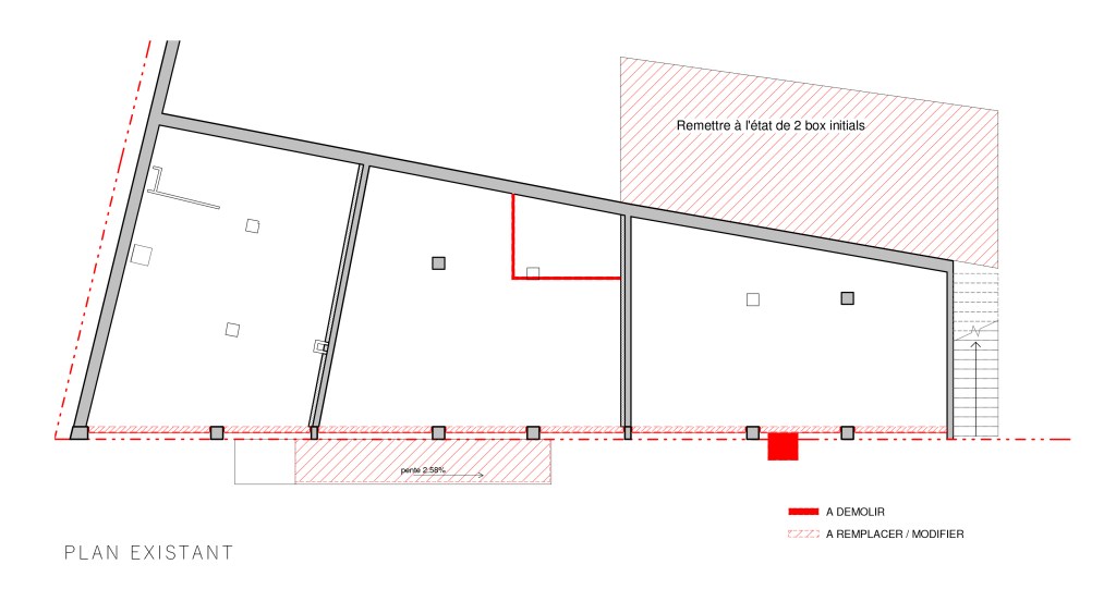 L’emprise du RDC fait l’objet d’une opération de changement de destination d’un espace commercial en 3 logements PM. Le volume du bâtiment reste inchangé. De ce fait, l’espace intérieur sera reconfiguré et réhabilité pour la création des 3 logements PMR, dans le respect des normes et de la réglementation en vigueur.