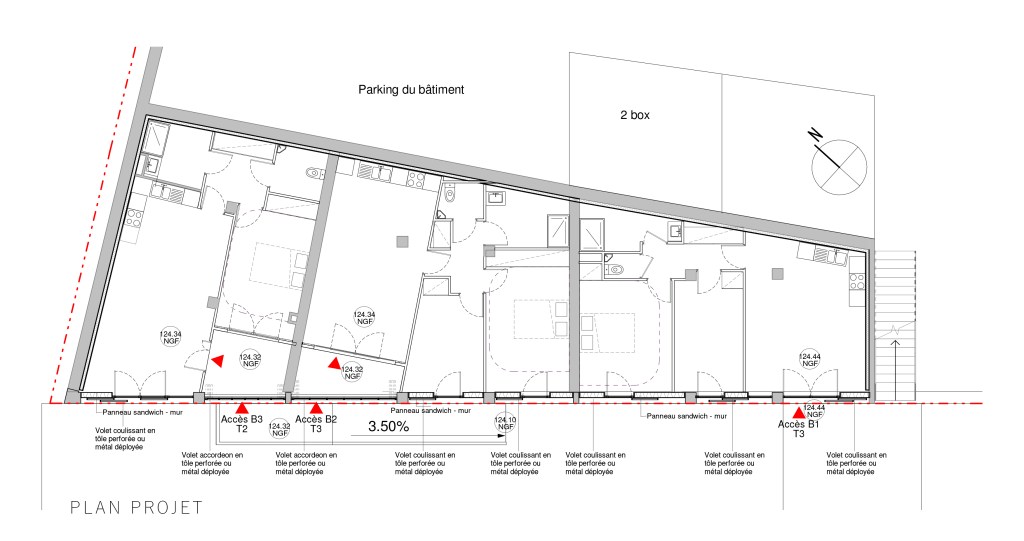 Dans un premier temps, il s’agit de réaffecter les rampes PMR pour accéder aux logements. Suite à la redistribution des espaces intérieurs, les grandes baies vitrées seront remplacées par de grands ensembles composés par les panneaux sandwich, les fenêtres ou portes fenêtres adaptées à la taille des pièces de vie des logements ainsi que des volets coulissants pour protéger les vues et la sécurité des logements.